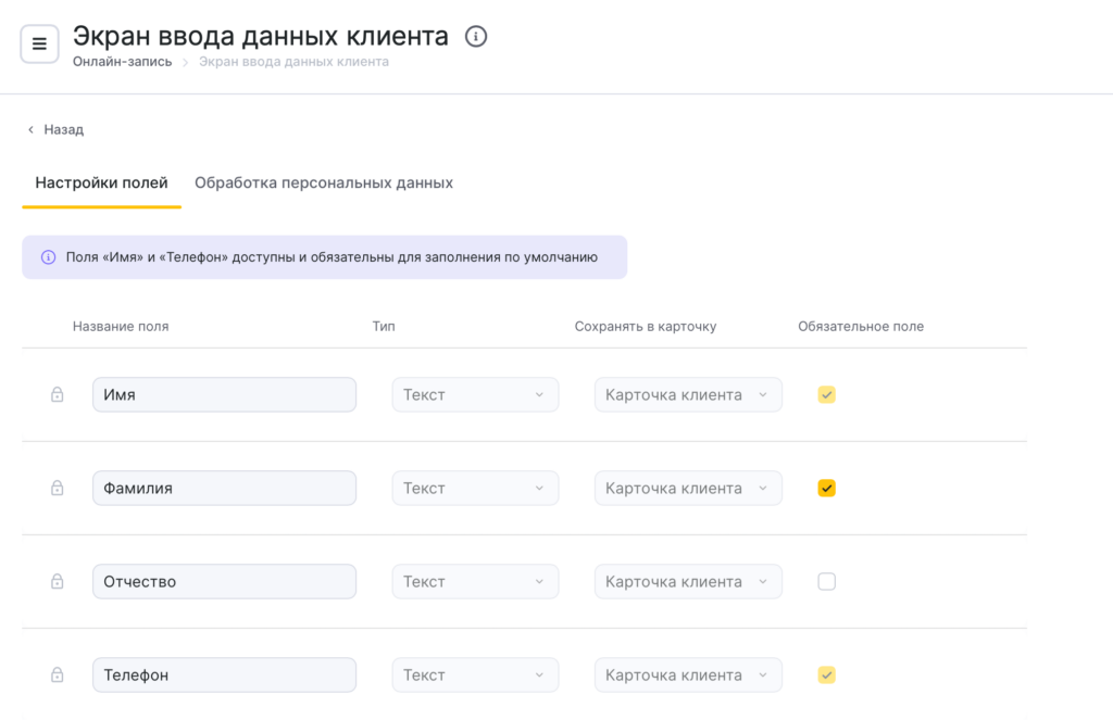 Если вам требуется дополнительная информация от клиентов, укажите обязательные поля для заполнения, например, комментарий, адрес электронной почты, фамилия и отчество (отображение этих полей предварительно активируйте в разделе Настройки > Журнал записей). При включённой настройке клиент не сможет записаться, пока не заполнит эти поля.