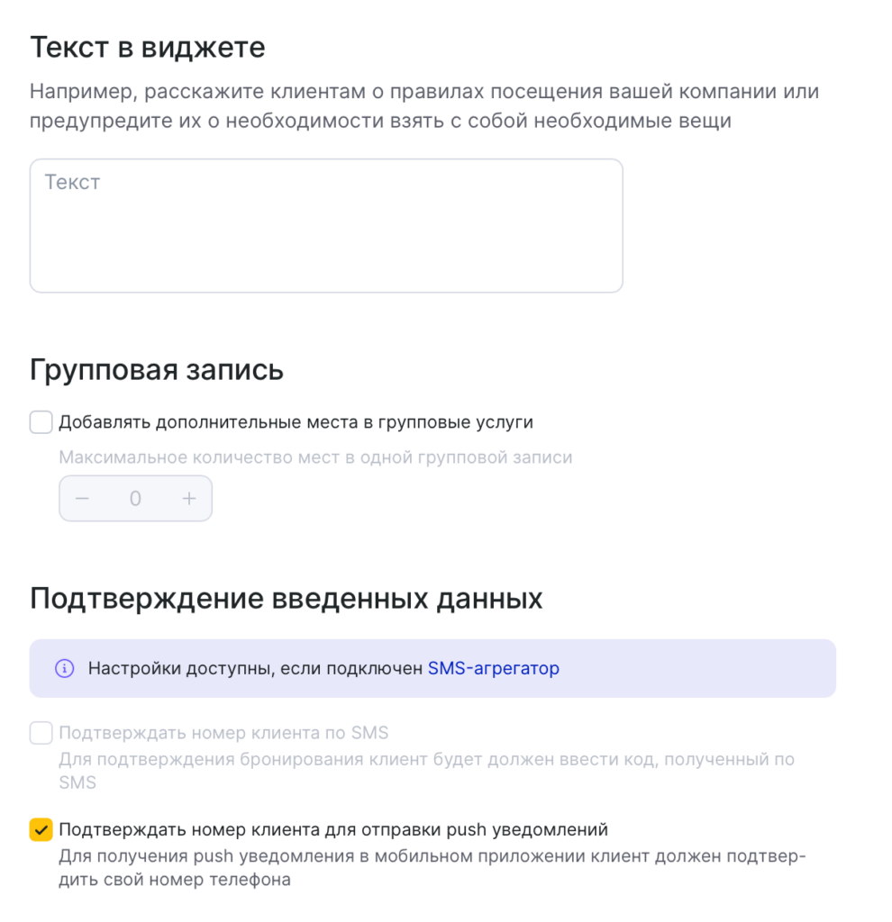 Кроме того, вы можете включить подтверждение номера клиента — по SMS или для отправки push-уведомлений.