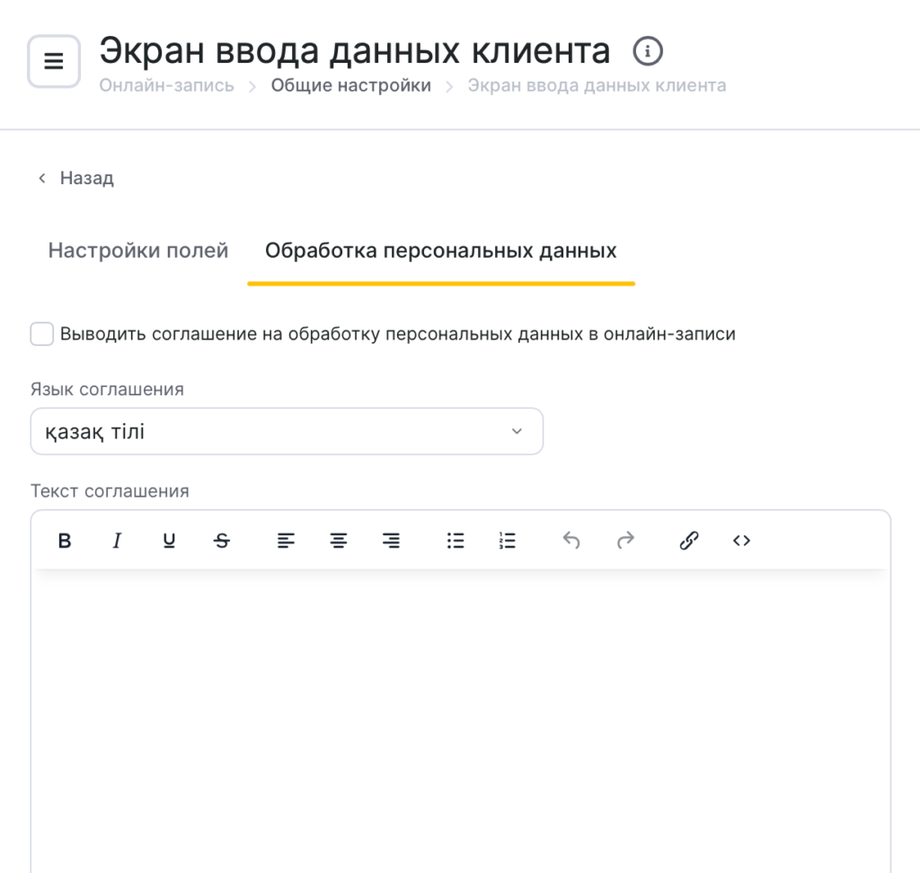 В этом же разделе вы можете настроить соглашение на обработку персональных данных. Текст соглашения предназначен для клиентов, которые используют виджет или брендированное мобильное приложение для онлайн-записи на ваши услуги.