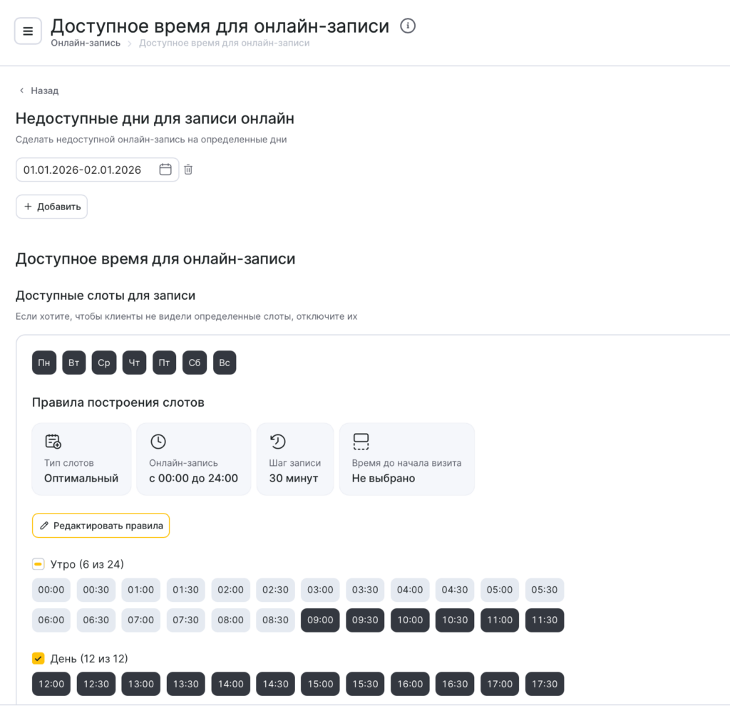 Использование этого ограничения помогает избежать изменений в последний момент и делает работу с расписанием более стабильной. Интервал можно настраивать с шагом в 15 минут, максимальное ограничение — до 48 часов до начала визита. Это защищает расписание от внезапных отмен и переносов и упрощает планирование работы.