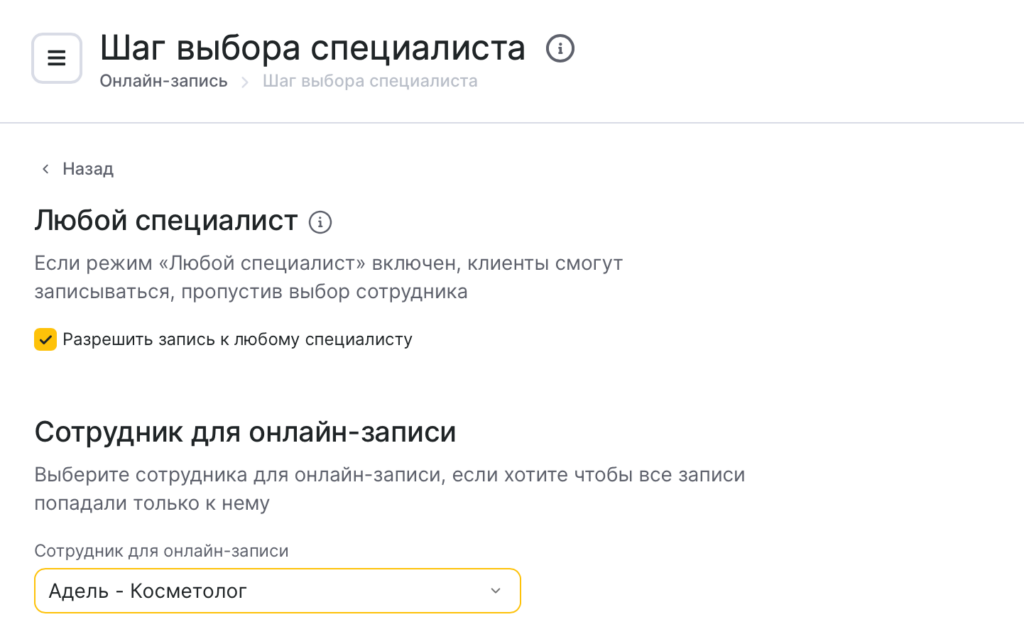 Этот режим также можно включить при настройке шагов онлайн-записи, указав вариант «Любой специалист» как выбор по умолчанию. Подробнее о настройке этих параметров читайте в соответствующей статье.