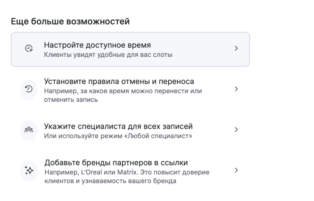 Этот блок объединяет расширенные настройки, которые помогают точнее управлять расписанием, ускорить процесс записи и повысить доверие клиентов.