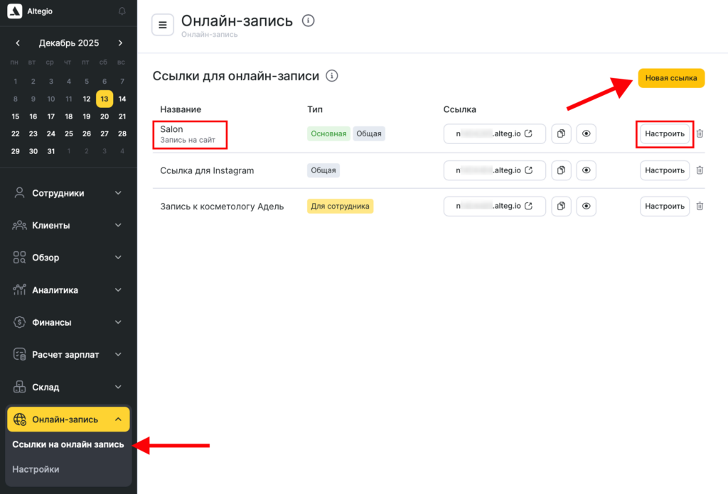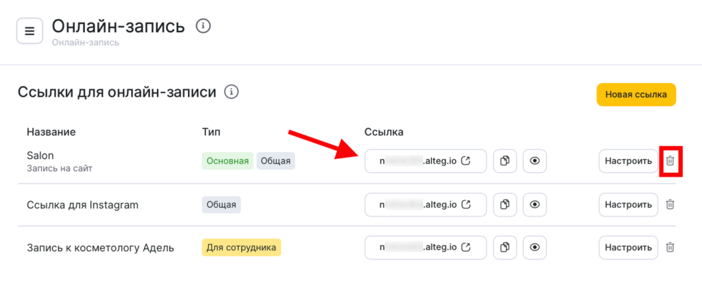 - Чтобы добавить новую ссылку онлайн-записи, перейдите в раздел Онлайн-запись > Ссылки на онлайн-запись. Нажмите кнопку Новая ссылка. Более подробное описание читайте здесь.