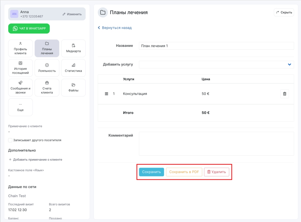 - Сохраните созданный план лечения. При необходимости можете также сохранить его в формате PDF и распечатать.