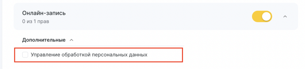 Вы можете предоставлять доступ к редактированию этой настройки только ограниченному количеству сотрудников. В разделе Сотрудники >Список сотрудников выберите нужного сотрудника, нажав на его имя. В его карточке перейдите на вкладку Доступ и установите/закройте доступ к разделу Онлайн-запись > Управление обработкой персональных данных.