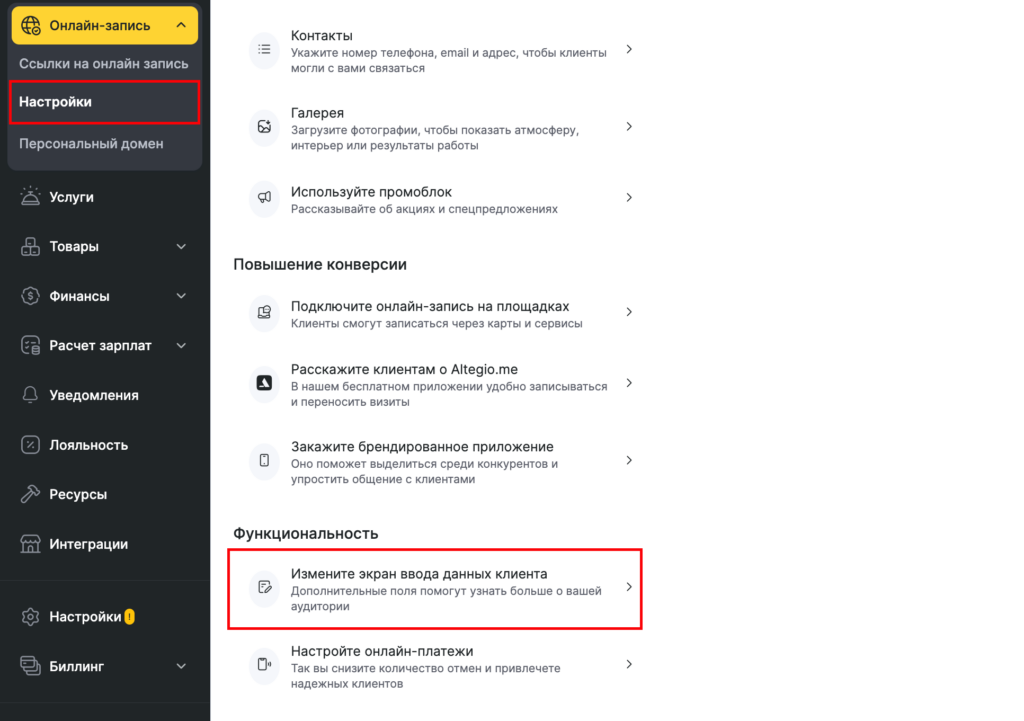 Перейдите в раздел Онлайн-запись > Настройки > Изменить экран ввода данных клиента.