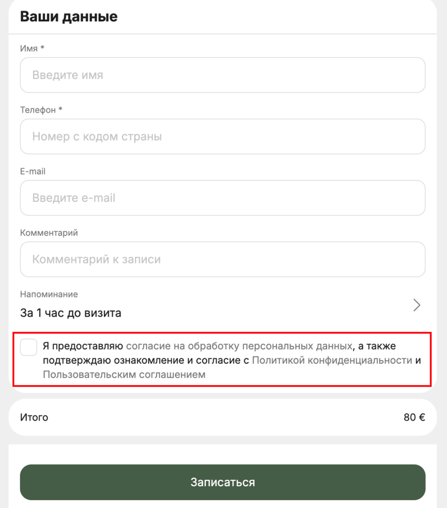 Клиент не сможет записаться, если не примет условия соглашения и не даст согласие на обработку персональных данных.
