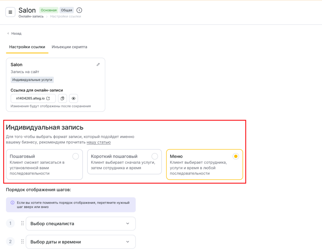 - Меню – если выбрана данная настройка, клиент сможет самостоятельно выбирать сотрудников, услуги и время в любой удобной последовательности. Это самый универсальный сценарий: позволяет клиентам записываться так, как им удобно прямо сейчас.