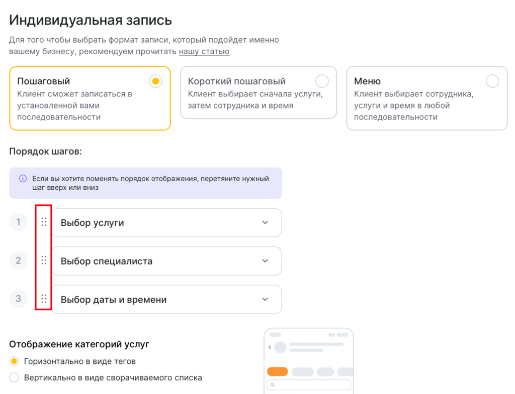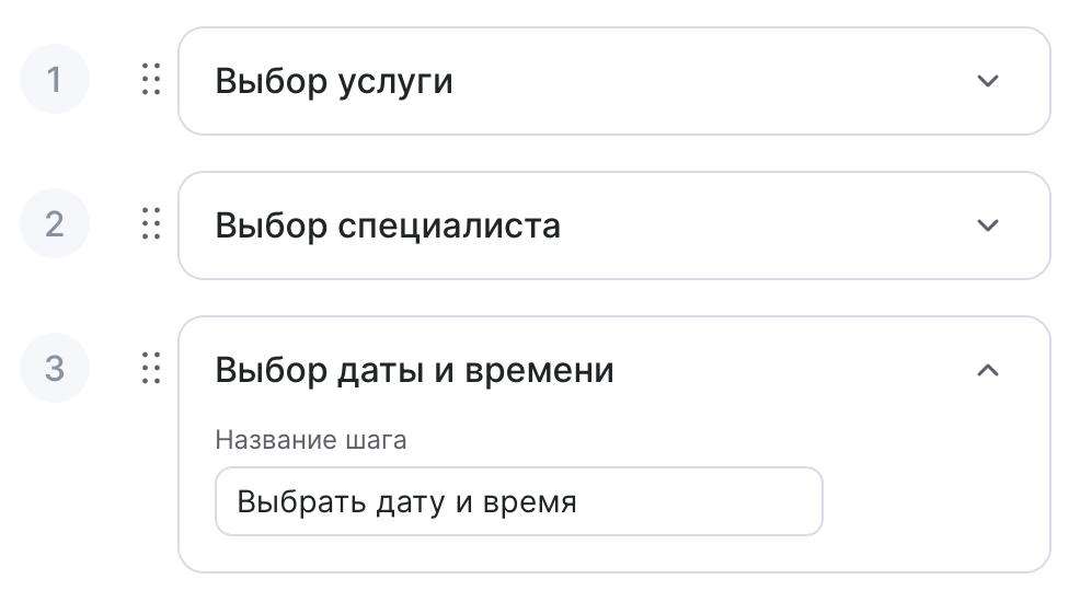 Чтобы изменить порядок шагов, нажмите и удерживайте кнопку с точками слева от названия шага, затем перетащите его в нужное место. Выбранная последовательность будет отображаться в виджете онлайн-записи.
