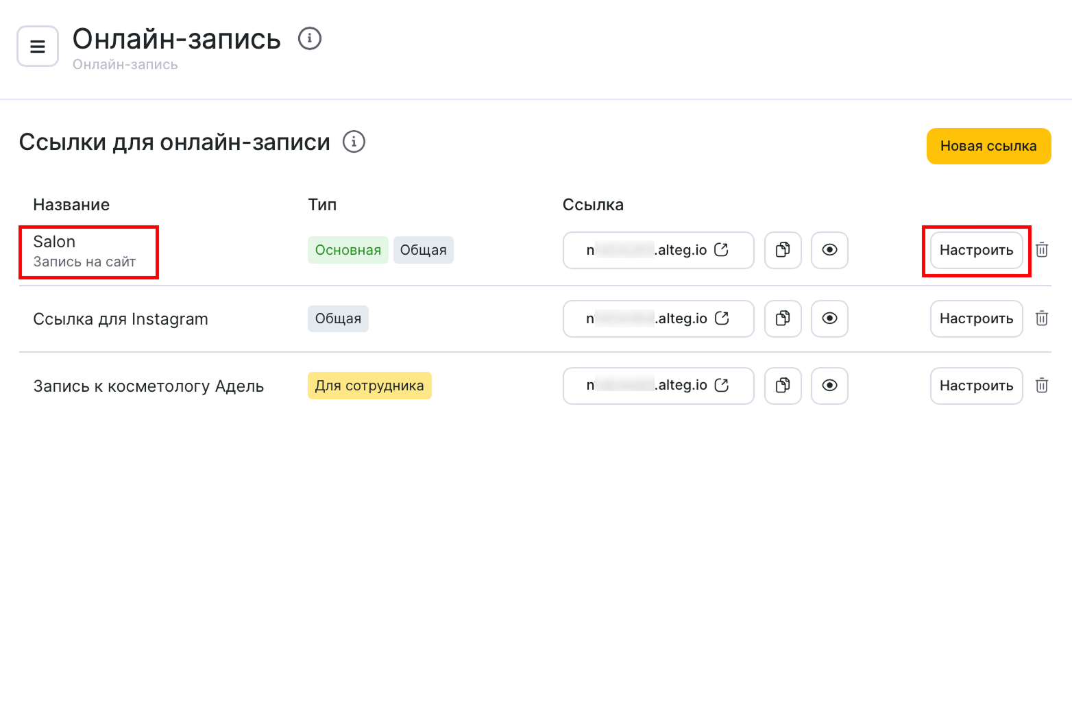 - Выберите необходимую ссылку для онлайн-записи, нажмите на ее название или используйте кнопку Настроить.