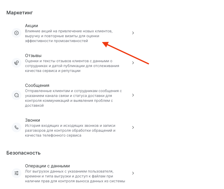 • На данный момент аналитику можно собрать только по следующим типам акций: Фиксированная скидка, Фиксированный кэшбек по проданному, Фиксированный кэшбек по оплаченному. По накопительным типам акций отчеты пока недоступны.