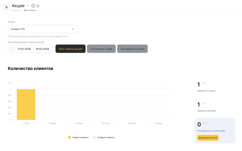В блоке Количество клиентов будут отображаться новые и повторные клиенты, пришедшие по акции за выбранный период.