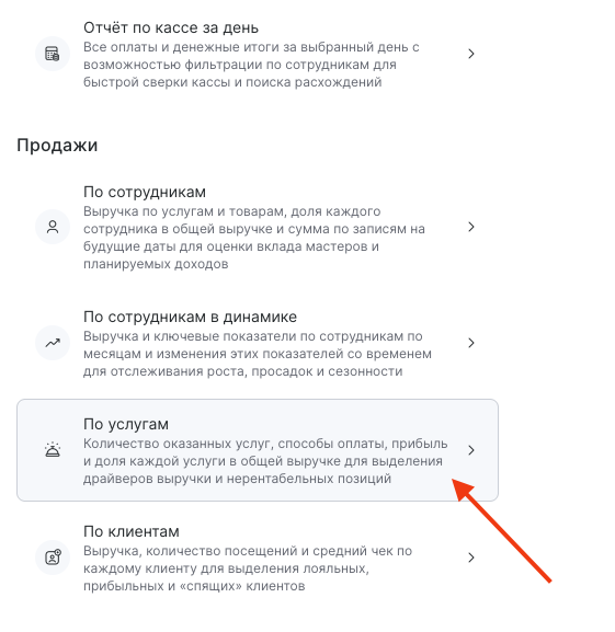 Раздел Отчеты > Все отчеты > Продажи > По услугам показывает статистические данные обо всех предоставленных услугах за определенный период. Данный раздел помогает руководителю проанализировать, какая услуга более востребована и приносит больше выручки, а какая не приносит заработка компании, следовательно, от нее можно отказаться или предпринять своевременные меры.