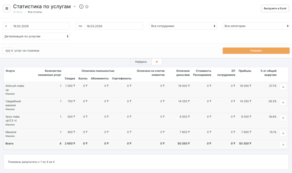Таким образом можно просмотреть, например, отчет о выручке конкретного сотрудника по одной услуге.