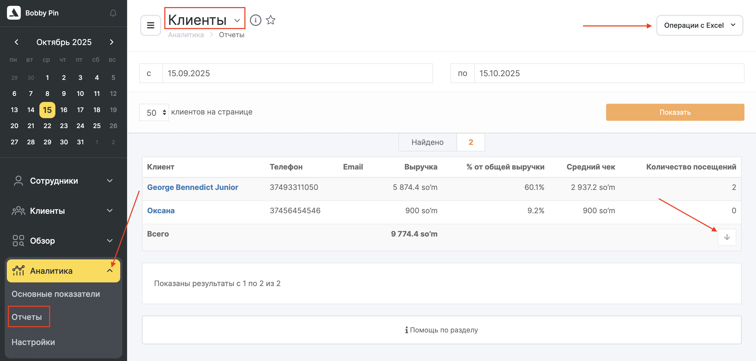 Раздел «Аналитика» > «Отчеты» > «По клиентам» показывает данные о выручке и посещениях всех клиентов, которые пользовались услугами компании за определенный период.
