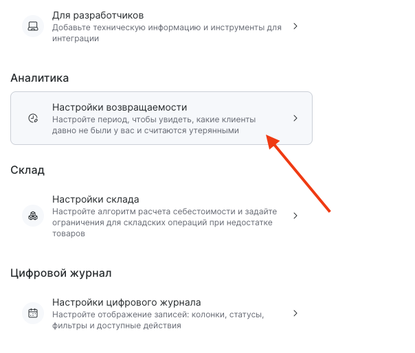 Для настройки периода потери перейдите в раздел Настройки > Аналитика > Настройки возвращаемости.