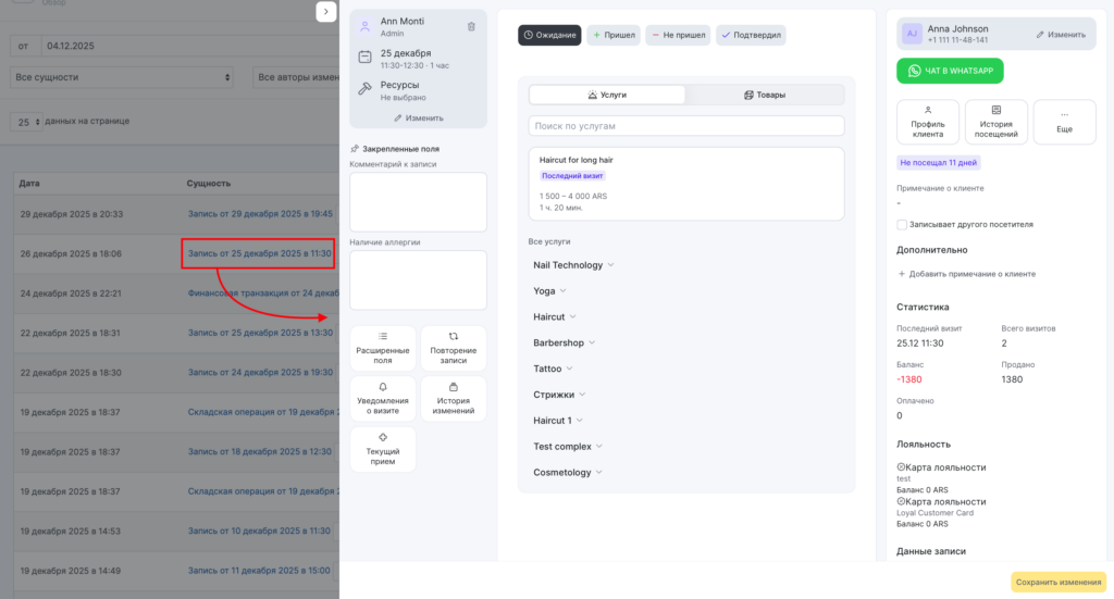 В разделе Обзор > Изменения данных представлена информация обо всех действиях (добавление, изменение, удаление) с записями, финансовыми и складскими операциями, которые были сделаны в Altegio.