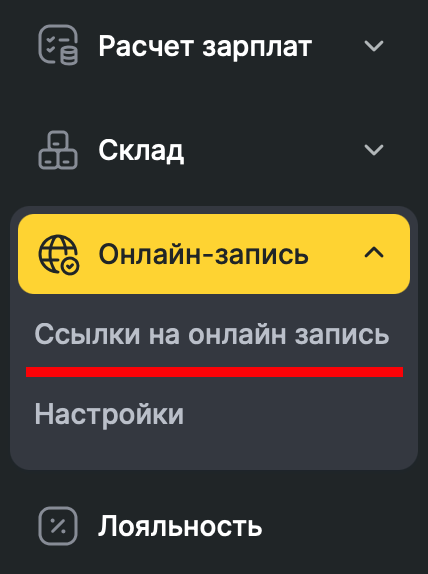 - В главном меню перейдите в раздел Онлайн-запись > Ссылки на онлайн запись.