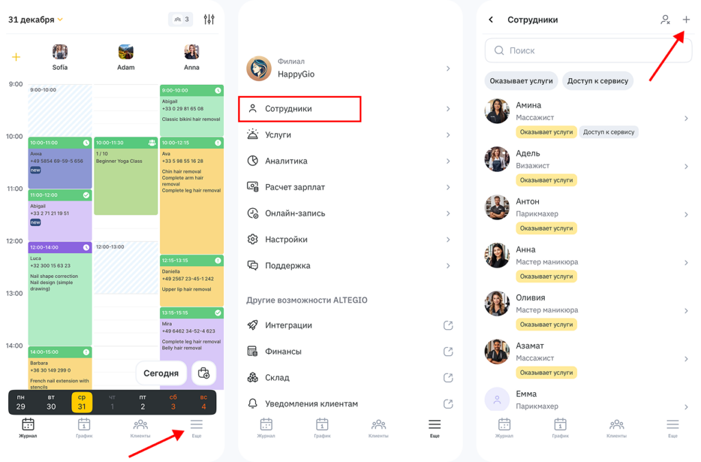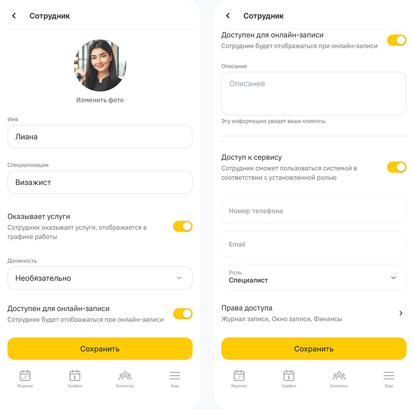 Настройки сотрудников можно задать как в веб-версии Altegio, так и в мобильном приложении. Все данные автоматически синхронизируются.
