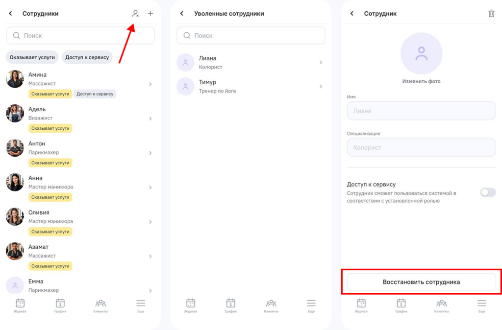 В мобильном приложении все уволенные сотрудники отображаются в списке. При необходимости их можно восстановить. Для этого откройте раздел Сотрудники и нажмите на иконку человечка в правом вверхнем углу. В списке нажмите на нужного сотрудника и на кнопку Восстановить сотрдудника.