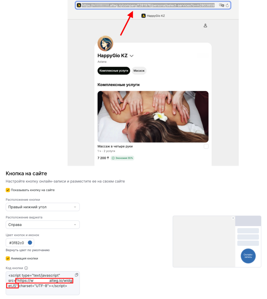 - Откройте виджет в отдельном окне и выберите параметр (услугу или сотрудника). Скопируйте ссылку в адресной строке и замените значение в коде произвольной кнопки (как показано на скриншот).