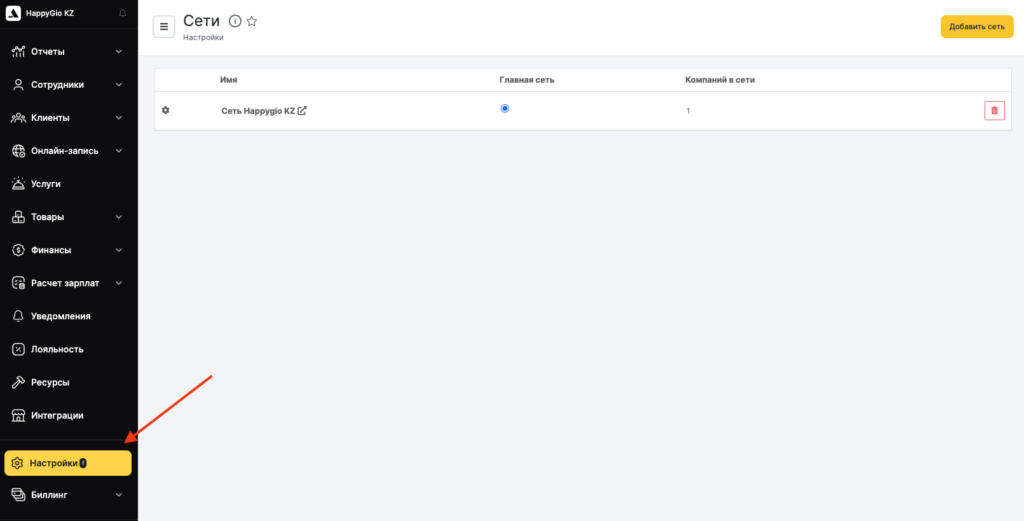 Altegio автоматически направит вас на страницу управления сетью в раздел Настройки > Основные (в сетевом интерфейсе).