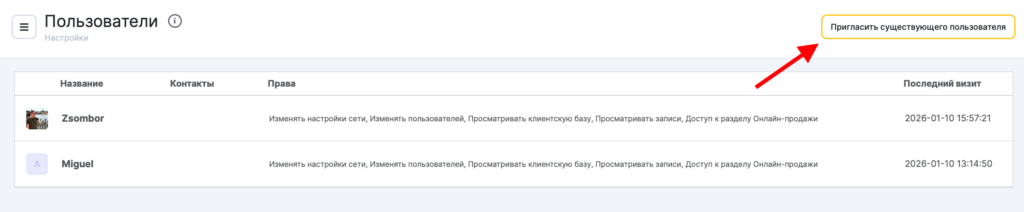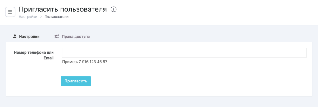 - Нажмите кнопку Пригласить существующего пользователя. Введите номер телефона или Email пользователя (тот, который он использует для входа в Altegio) и нажмите кнопку Пригласить.