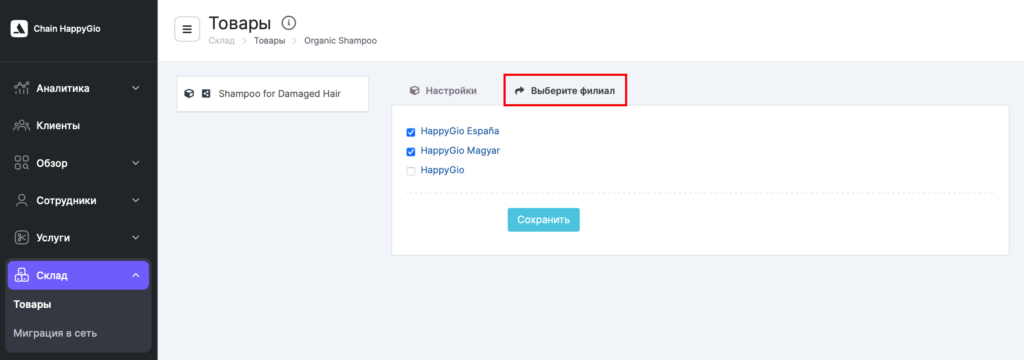 - Во вкладке Филиалы укажите, в какие филиалы нужно перенести данный товар, и нажмите кнопку Сохранить.