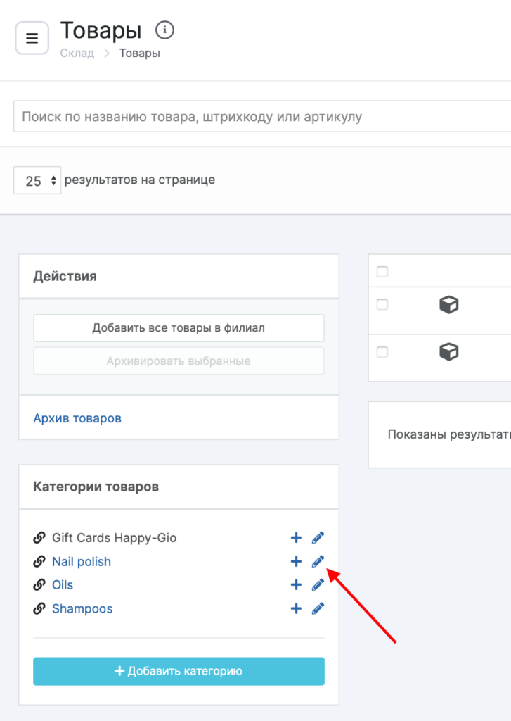 Информацию обо всех категориях товаров можно редактировать, настраивать и удалять. Для этого выберите категорию, нажмите на кнопку с изображением карандаша рядом с ее названием, в открывшемся новом окне измените/добавьте информацию или удалите категорию, нажмите кнопку Сохранить.