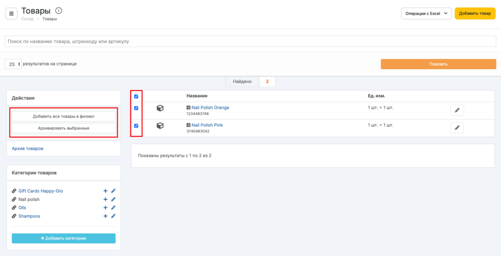 Аналогичным образом можно массово архивировать товары: выберите товары и нажмите кнопку Архивировать выбранные.