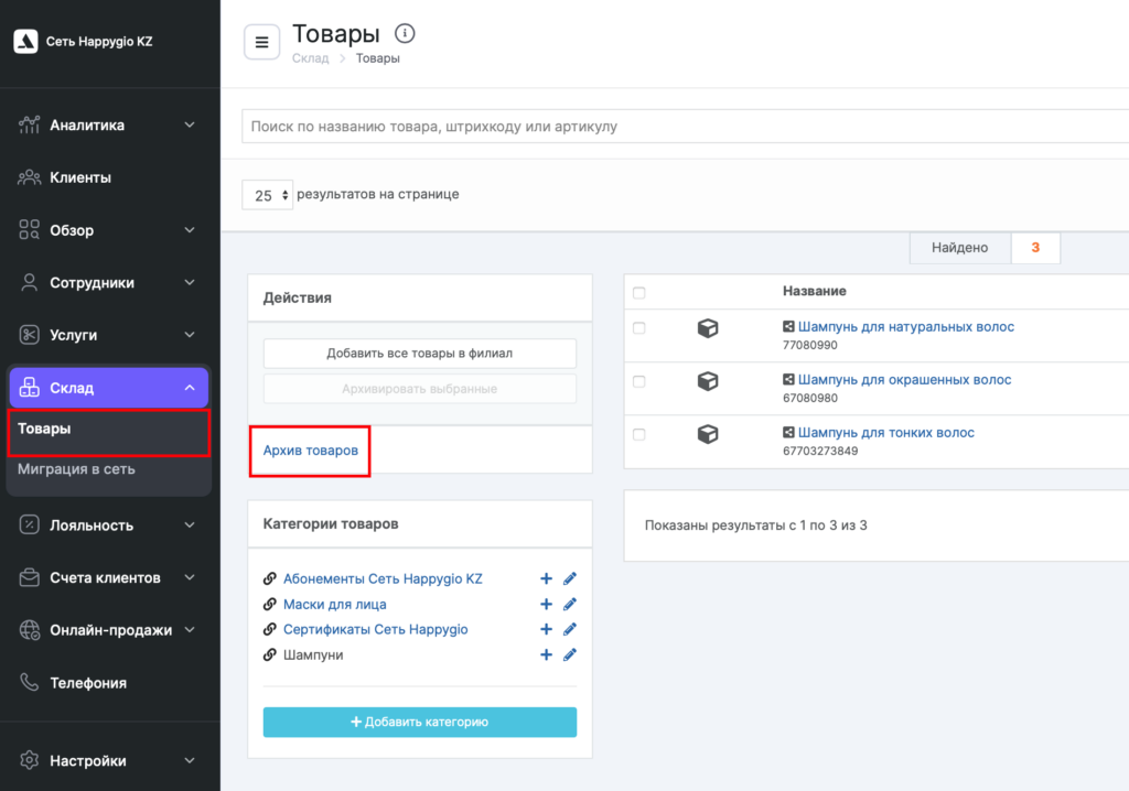 Заархивированные товары будут находиться в сетевом интерфейсе в разделе Склад > Товары.
