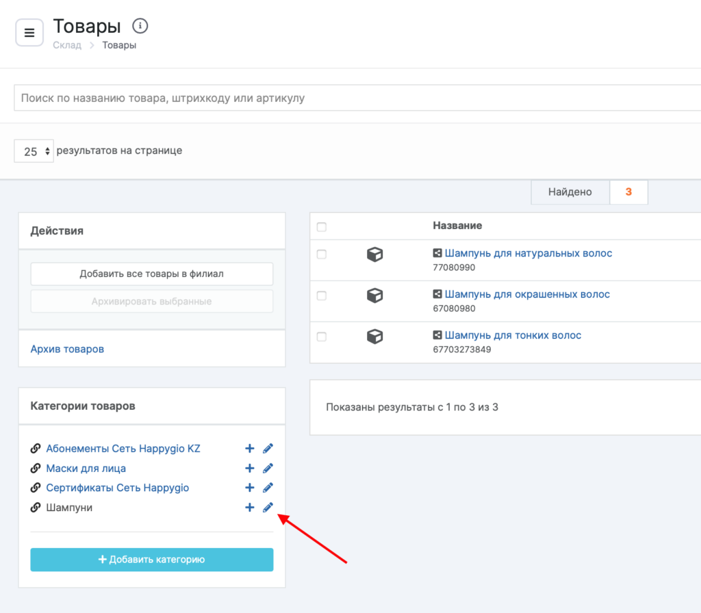 - Чтобы заархивировать категорию товаров, перейдите в сетевой интерфейс в раздел Склад > Товары и начните редактировать необходимую категорию, нажав на иконку карандаша.