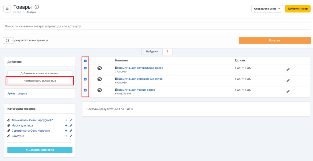 - Вы можете заархивировать сразу несколько товаров. Выберите нужную категорию, поставьте галочки перед названиями товаров, нажмите кнопку Архивировать выбранные.