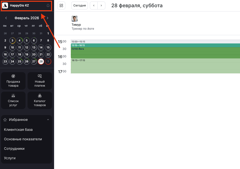 - Нажмите на название филиала в верхнем левом углу.