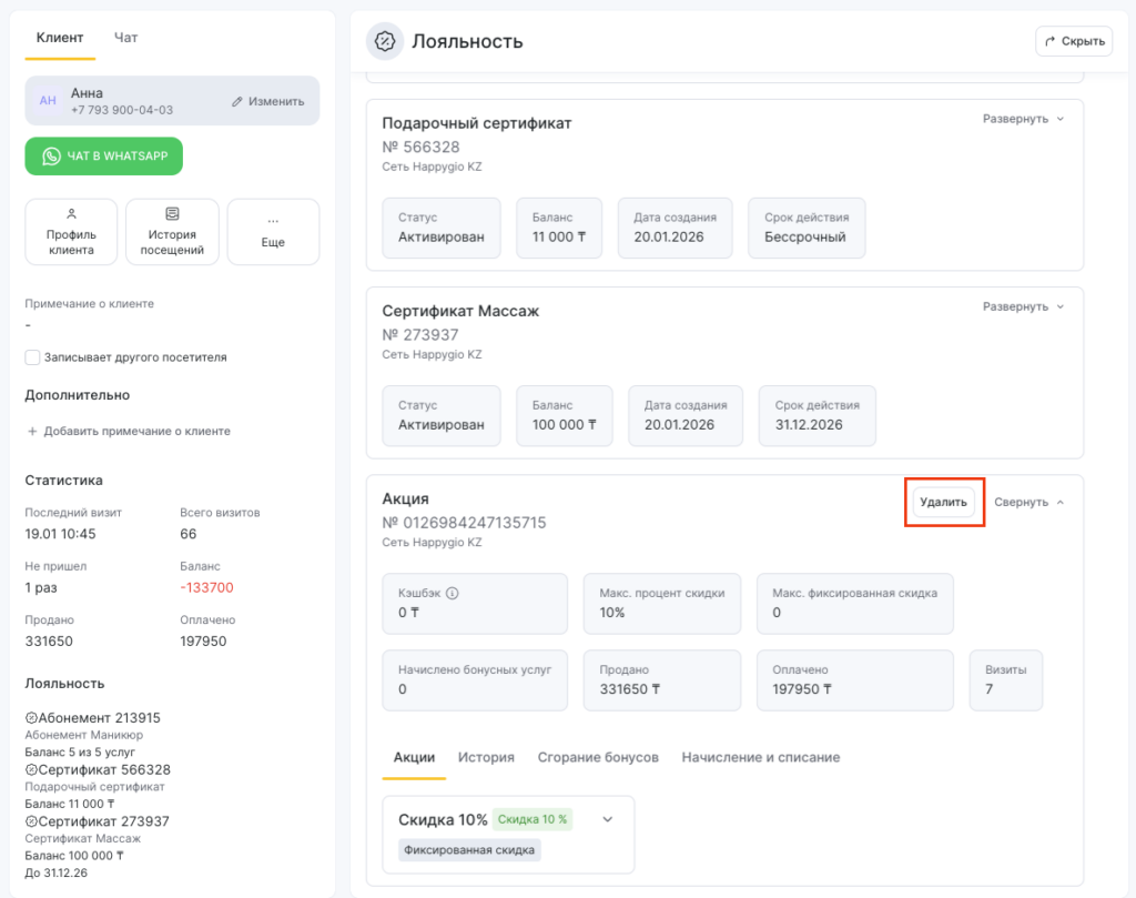 Выдавать и удалять карты лояльности клиенту можно двумя способами: