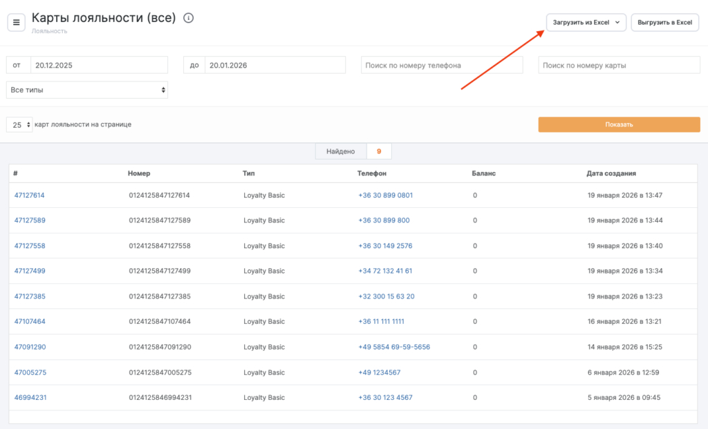 В сетевом интерфейсе перейдите в раздел Лояльность > Карты лояльности и нажмите кнопку Загрузить из Excel.