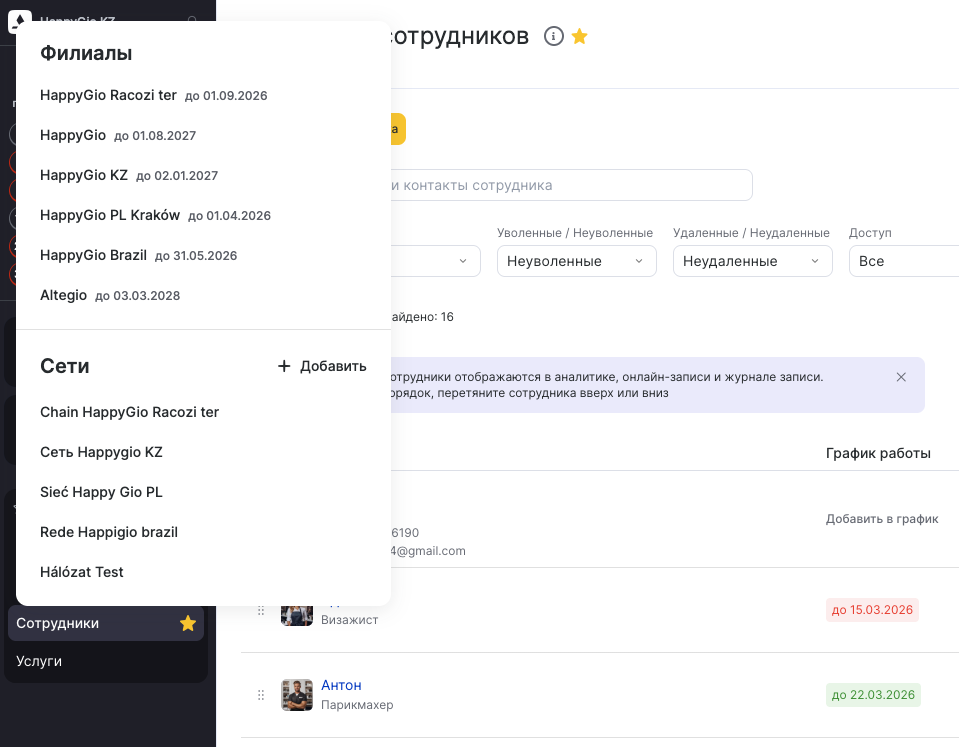 В Altegio есть 2 вида пространств: филиалы и сети. Филиалы — с желтым выделением слева, сети — с фиолетовым выделением слева. В филиалах и сетях находятся разные разделы.