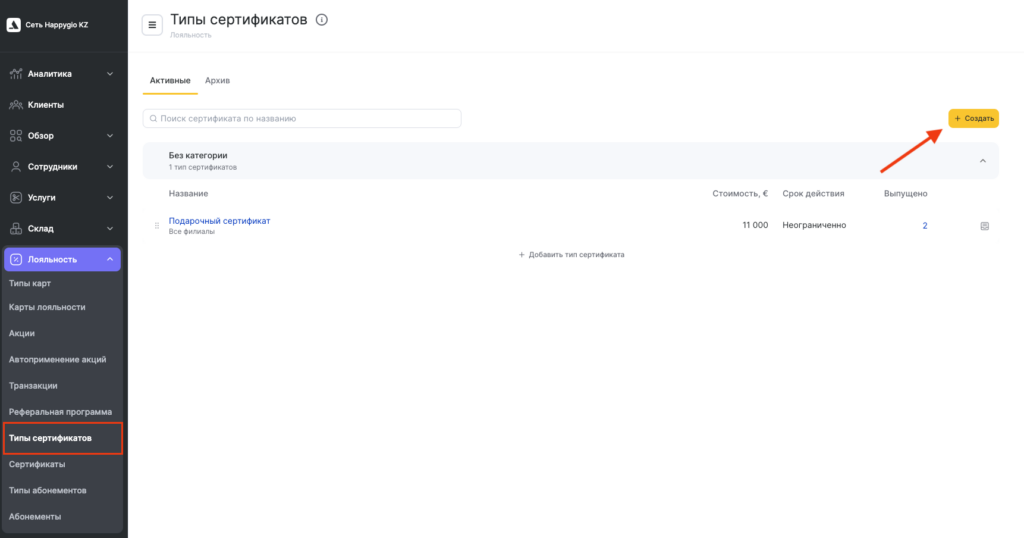 - В сетевом интерфейсе перейдите в раздел Лояльность > Типы сертификатов и нажмите кнопку Создать > Тип сертификата.