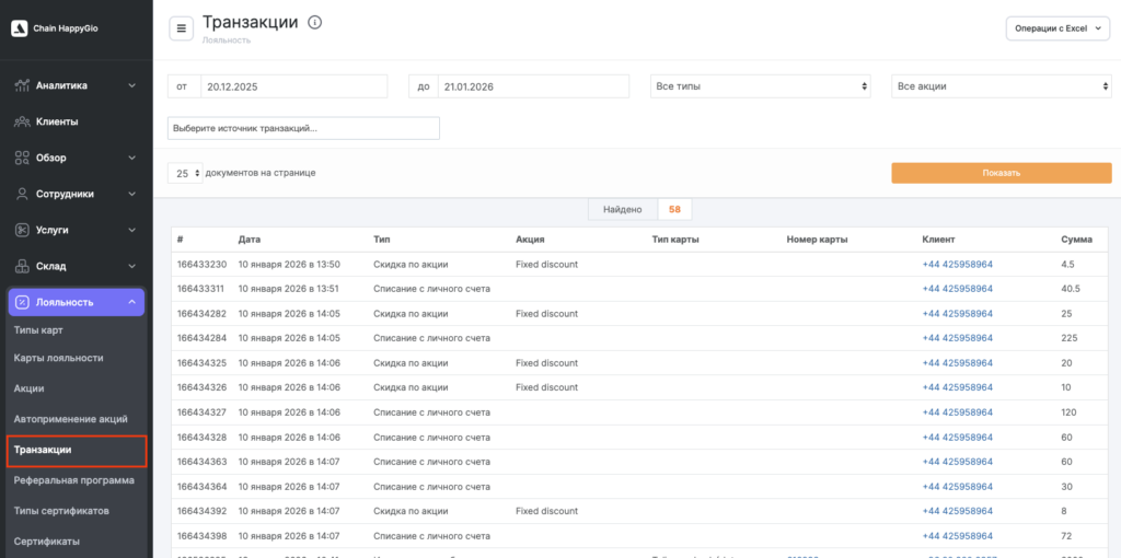 В разделе Лояльность > Транзакции выводятся следующие данные по операциям: