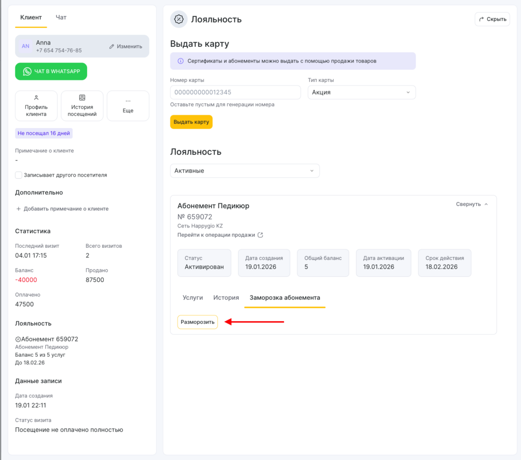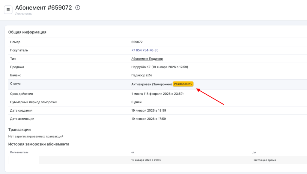 - Размораживается абонемент аналогично через кнопку Разморозить. Если абонемент был заморожен на определенный период, то по истечению этого периода, абонемент разморозится автоматически.