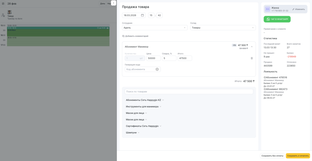 Этим способом вы можете продать абонемент через журнал записи или через раздел «Склад» > «Складские операции».