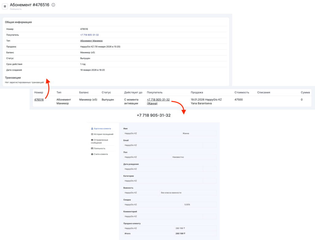 Данные в столбцах Номер и Покупатель представлены в виде кликабельных ссылок, которые ведут на страницу с детальной информацией об абонементе и карточку клиента.