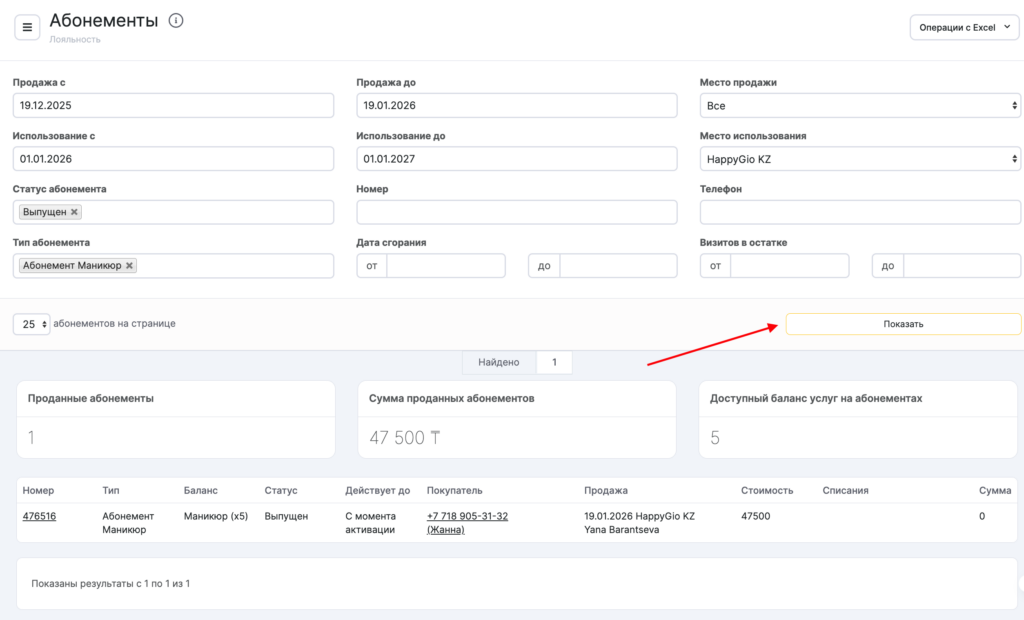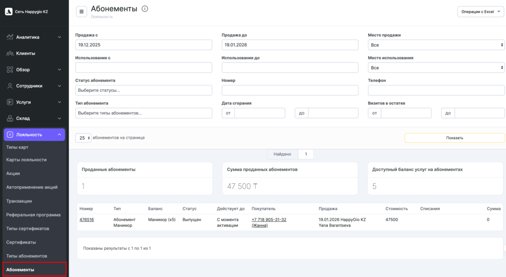 При необходимости всю информацию об абонементах можно выгрузить в Excel через кнопку Операции с Excel > Выгрузить в Excel в правом верхнем углу.