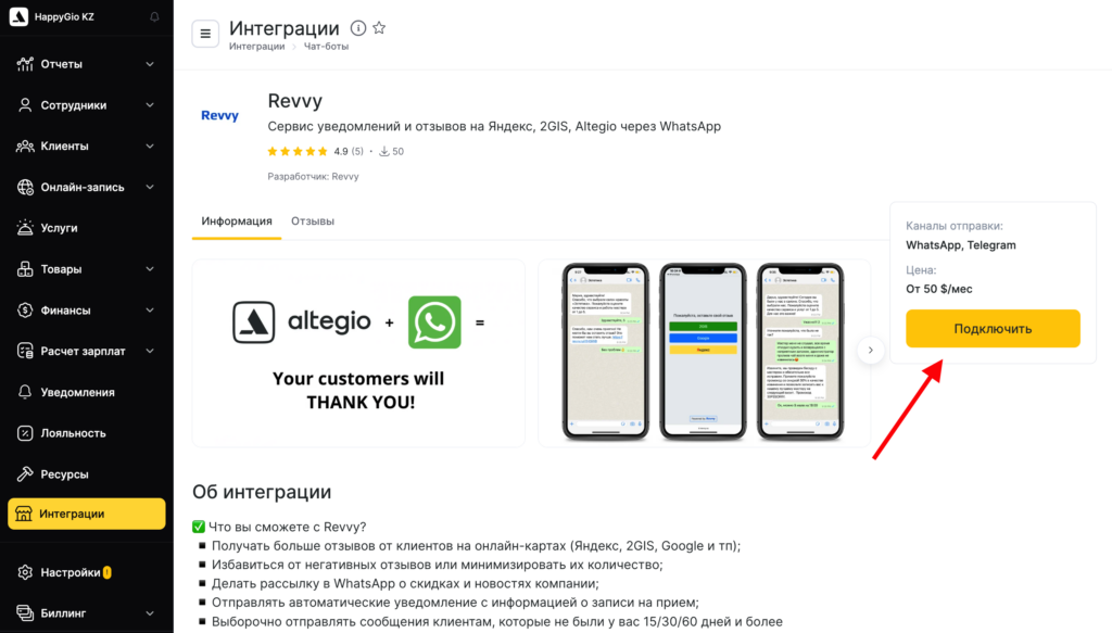 - Удобное общение с клиентами прямо через WhatsApp или личный кабинет Revvy