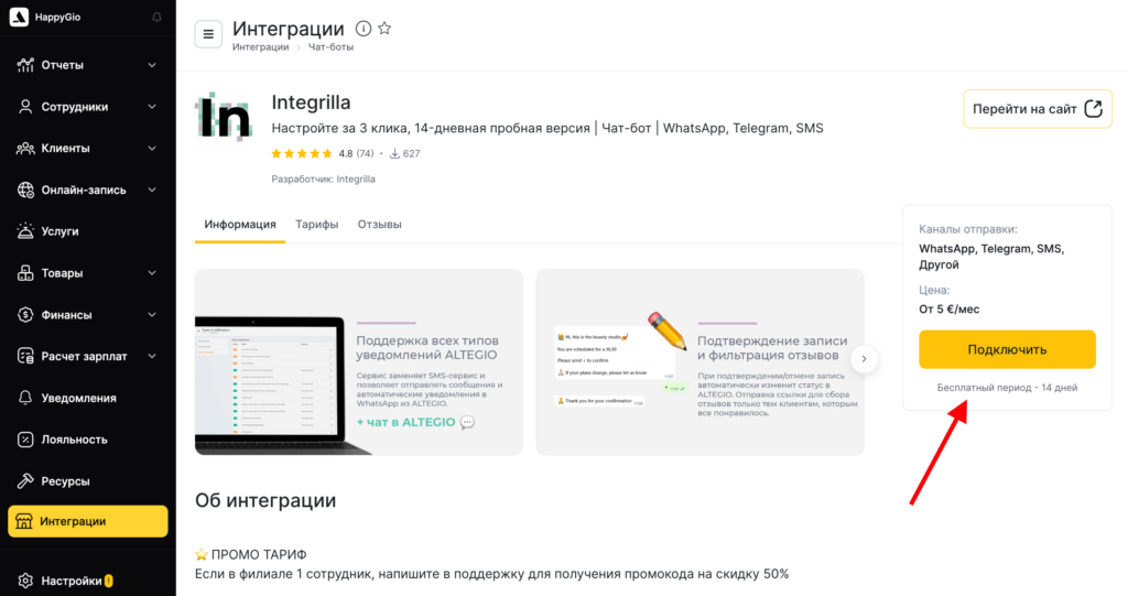 - В Altegio в режиме Администрирование перейдите в раздел Интеграции > Уведомления и выберите приложение Integrilla или по ссылке https://app.alteg.io/e/mp_186_intgrla/.