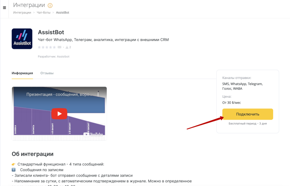 - В Altegio перейдите в раздел Интеграции > Уведомления и выберите приложение AssistBot или перейдите по ссылке https://app.alteg.io/e/mp_38_assist/ .