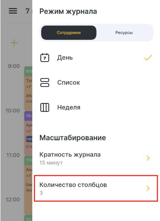 Если выбран режим Неделя, то эта настройка не отображается. Если пользователь переключился обратно с режима Неделя на режим День, то количество столбцов будет соответствовать установленному пользователем ранее.