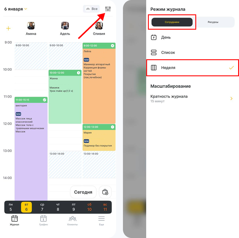 2. Выберите режим журнала Сотрудники, затем Неделя.