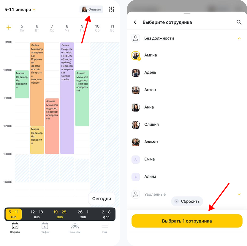 1. После откроется журнал записи, выберите нужного сотрудника в списке в правом верхнем углу.