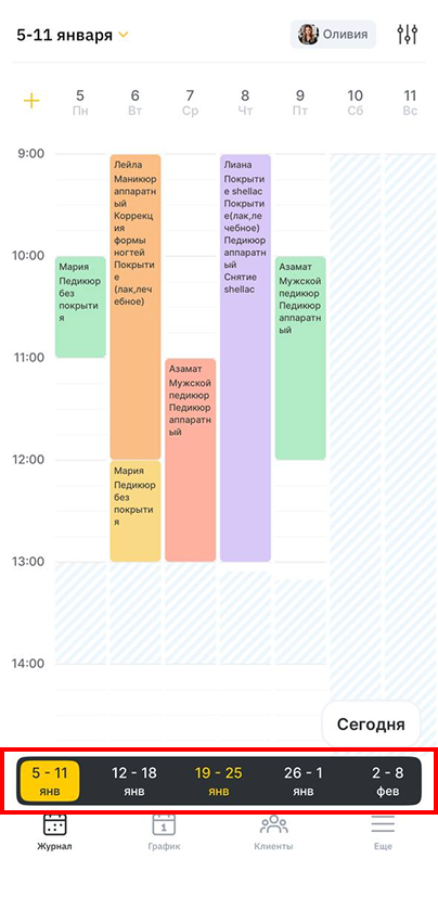 В мобильном приложении Altegio доступна возможность просматривать журнал записи в режиме Неделя. Сотрудники и администраторы смогут оценить занятость на продолжительный период.